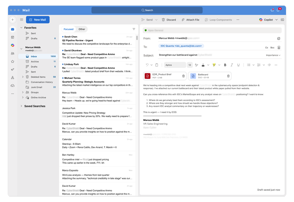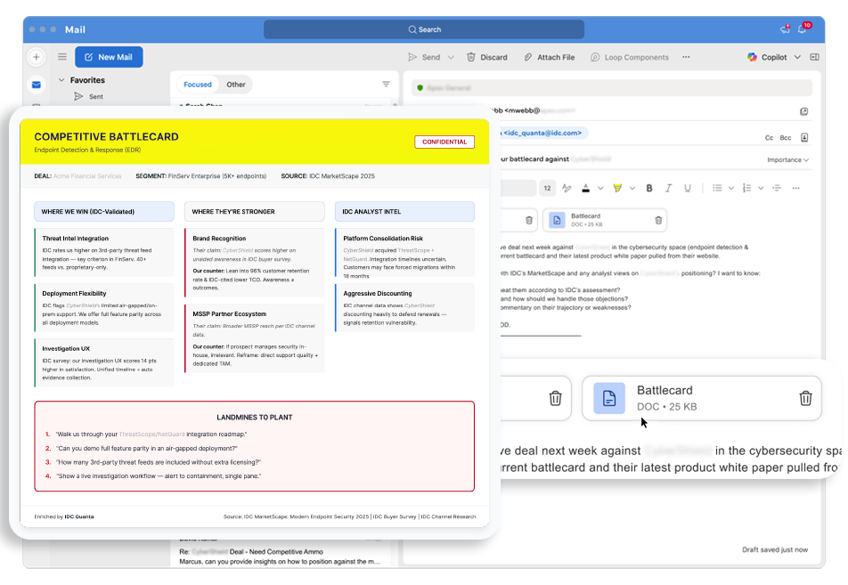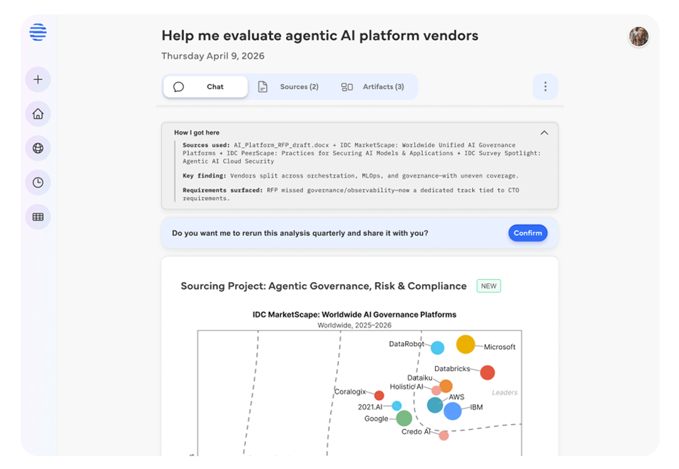 Combine your own documents with IDC research in a single session. Context carries forward automatically.