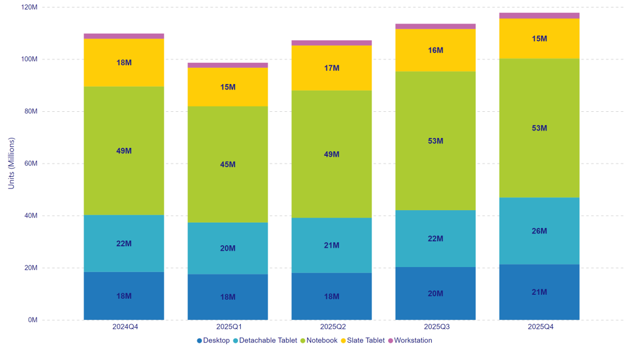 Global Personal Computing Device shipments grew 7.3% year-over-year in the fourth quarter of 2025, reaching 117.8 million units. PC shipments grew by 10.3% year-over-year with 76.9 million unit shipments and tablets grew by 1.9% year-over-year with 40.9 million unit shipments in the quarter. The results cap off a tumultuous year for the market, marked by the end of support for Windows 10, which drove a wave of upgrade demand for PCs, and early year tariff concerns that prompted vendors to pull forward more inventory than originally planned. While the holiday season typically drives stronger demand, the surge in late 2025 was further amplified by emerging memory shortages that led buyers and brands to secure inventory ahead of anticipated price increases in 2026.