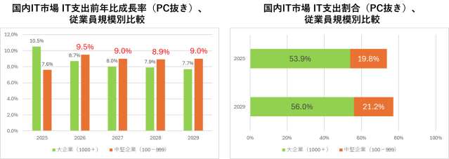 従業員数100~999名の中堅企業は、IT支出全体に占める割合を2025年の19.8%から2029年には21.2%へと拡大する見込みです。さらに2026年には、中堅企業のIT支出(PCを除く)は前年比9.5%増と予測されており、大企業の8.7%増を上回ります。