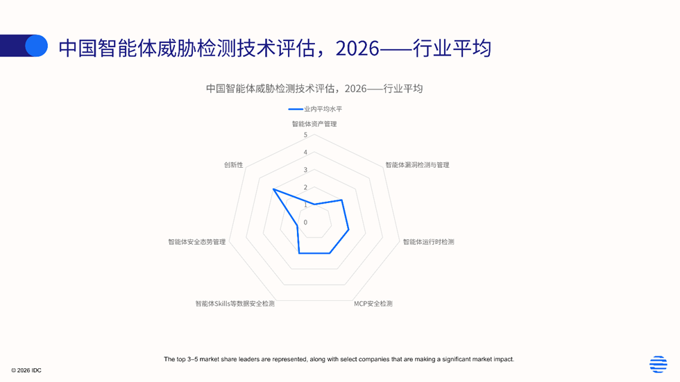 IDC在最新发布的《中国智能体威胁检测技术评估,2026》报告指出,当前市场上的智能体安全能力正在从单点检测向体系化治理演进,相关能力涵盖资产管理、漏洞检测、运行时监测、协议安全、数据安全以及安全态势管理等多个方向。该报告综合评估了国内主要厂商在相关领域的技术能力,报告入选厂商包括360数字安全集团、安恒信息、阿里巴巴、火山引擎、华为、君同未来、绿盟科技、领信数科、启明星辰集团、瑞数信息、新华三、亚信安全以及中国电信等 。截止到2026年4月,中国智能体威胁检测这一市场仍处于技术快速迭代的状态,技术服务提供商的产品服务能力仍处于快速补齐功能的阶段,技术的精细化、行业化水平仍存在不足。