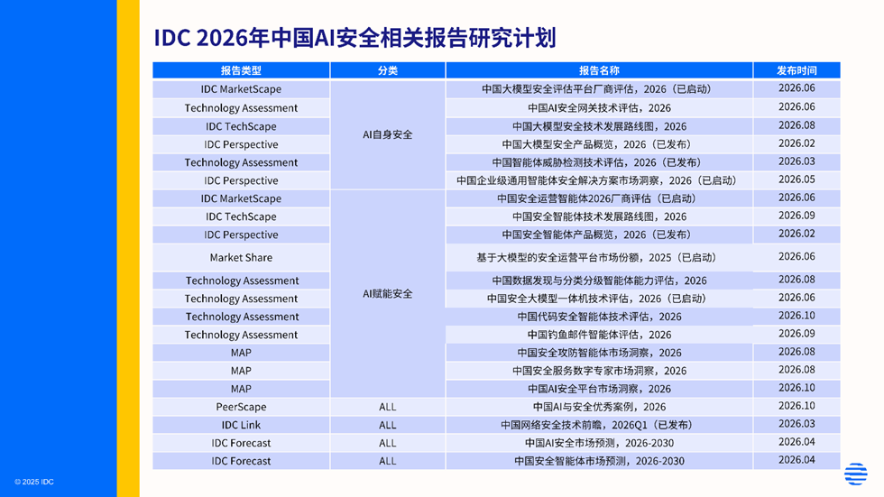IDC已于2026年启动AI安全技术系列研究,围绕AI原生安全架构、安全智能体成熟度评估、AI驱动DevSecOps实践路径以及企业级AI治理框架等方向展开持续跟踪与分析。对于希望进一步了解相关研究、评估自身AI安全能力或探讨落地路径的企业,欢迎与IDC分析师团队进行深入沟通,以获得更具针对性的洞察与建议。