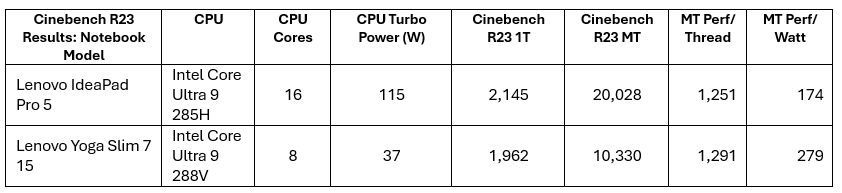 Intel provided IDC with samples of the Lenovo IdeaPad Pro 5 (model 16IAH10) featuring the 16-core Intel Core Ultra 9 285H, and the Lenovo Yoga Slim 7 15 (model 15ILL9), featuring the eight-core Intel Core Ultra 9 288V. Both these thin and light notebooks are solid options for business, content creation, light gaming, and other demanding tasks, but target quite different performance, battery life, and user workload requirements.