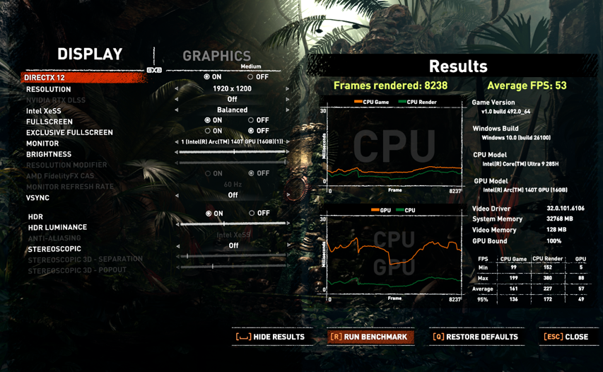 The Lenovo IdeaPad Pro 5 showed entry-level gaming performance across various titles. In The Shadow of the Tomb Raider, it achieved an average of 53 FPS on medium settings with XeSS set to balanced, at 1920×1200 resolution.