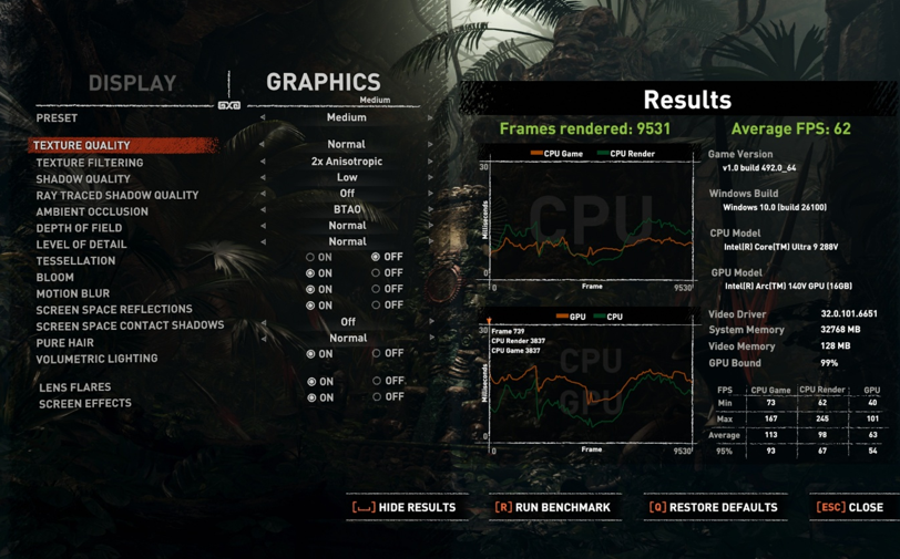 Turning to the Lenovo Yoga Slim 7 15, the Intel Core Ultra 9 achieved 62 FPS on average, highlighting the advances that Intel has made with the Xe2-based iGPU.