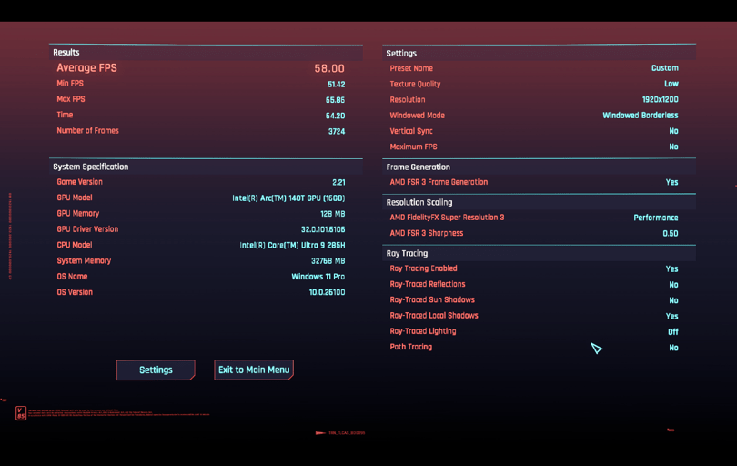 - In Cyberpunk 2077, the built-in benchmark showed 31 FPS on average with the low ray tracing preset and Intel XeSS 1.3 set to auto. Disabling ray tracing and using the low preset increased the frame rate to 51 FPS.