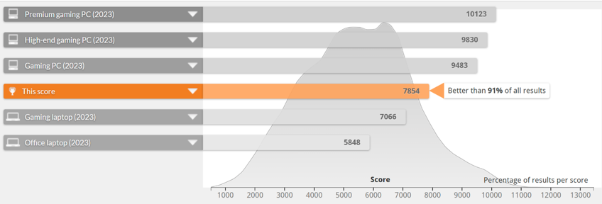 The IdeaPad Pro 5 with the Intel Core Ultra 9 285H ‘Arrow Lake’ CPU achieved a score of 7,854, outperforming 91% of all results produced by PCMark 10. This is a strong performance that shows the productivity-focused performance advantage of the extra cores in the Intel Core Ultra 9 285H compared to the all-day efficient performance approach of the four Performance cores and the four Efficiency cores in the Intel Core Ultra 9 288V ‘Lunar Lake’ CPU, which scored a still very competitive 6,968 but at significantly lower power draw with much improved battery life.
