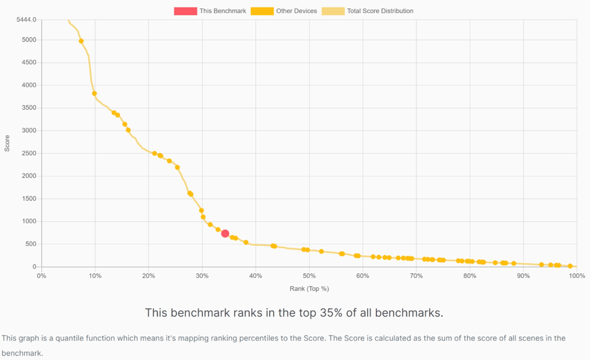 Blender Benchmark version 4.3.0 was used to assess the Intel Arc 140T GPU’s rendering performance. With a score of 761, the GPU’s performance ranked among the top 35% of benchmarks running the same workload.
