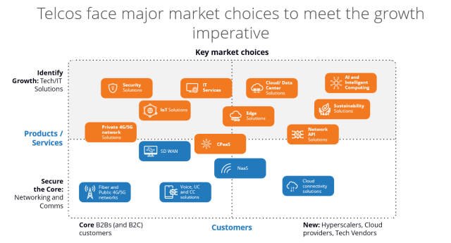 As it stands, telcos need to address dozens of “where to play,” “how to win,” and “how to execute” jobs to be done — and do these extremely well — as they seek to address the growth imperative, illustrated on the left-hand side of the diagram below: