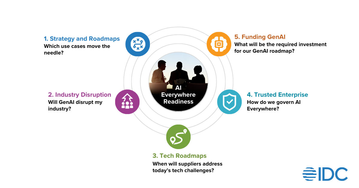 GenAI triggers a new leg of the digital journey, one IDC refers to as AI Everywhere. In this next leg of the journey, business leaders will need to adjust their strategy, invest in new technologies, and cultivate new skills. As leaders prepare their organizations for AI Everywhere, they face the following critical decisions.