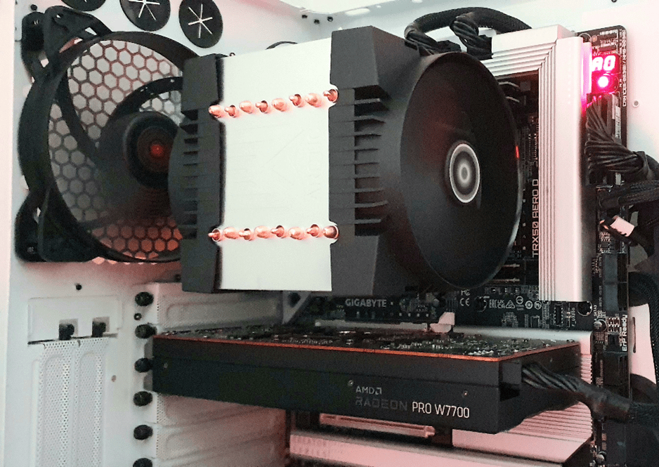 Although the Radeon Pro W7700’s power output stayed under 140W, we were not as satisfied with its clock speed, and thought there was potential for a higher frequency that was purposefully regulated. With our 850W platinum power supply, we had no trouble operating the system overall, and were even able to install it in a midi tower case.