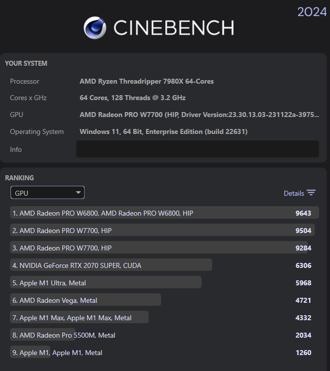 The 2024 edition of Cinebench now includes a GPU benchmark that takes advantage of Redshift, Cinema 4D’s default rendering engine. The Radeon PRO W7700 scored 9,504, nearly matching the Radeon Pro W6800, which scored 9,643 (according to the test database). This result demonstrates the level of sophistication of RDNA 3 computation, given the Radeon Pro W7700 has half the infinity cache and dedicated graphics RAM of the W6800.