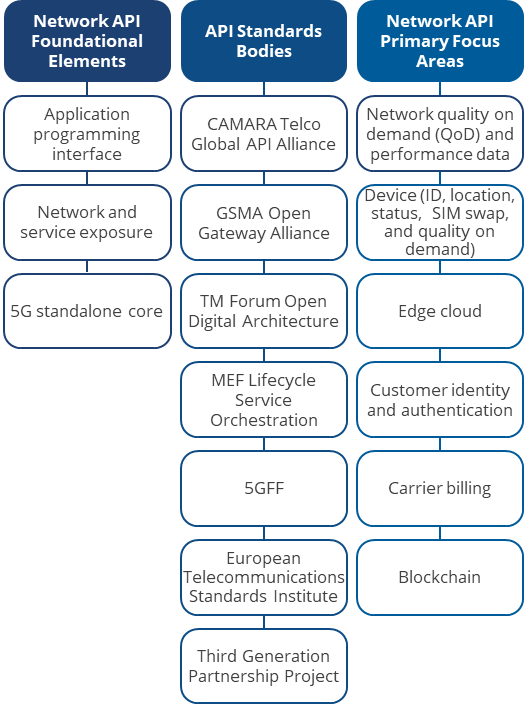 • Hyperscalers: Hyperscale cloud providers (HCPs) provide a potential path for integrating network APIs via an API gateway and to integrate network performance capabilities enabled through these network APIs, along with cloud computing and storage, in order to build high-value applications in support of a number of vertical markets and use cases. HCPs all support enormous bases of cloud developers that are well-versed in API consumption and lifecycle management. HCPs are actively participating in industry initiatives such as CAMARA and the GSMA Open Gateway Alliance, and represent a significant potential opportunity.