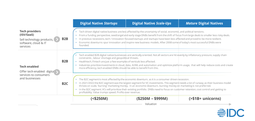 The current economic downturn has had a significant impact on businesses across industries. Digital native businesses (DNBs) are no exception. IDC defines DNBs as companies built based on modern, cloud-native technologies, leveraging data and AI across all aspects of their operations, from logistics to business models to customer engagement. All core value or revenue-generating processes are dependent on digital technology. A DNB leverages its ecosystem of stakeholders (i.e., customers, partners, suppliers, and the community) to drive community-led innovation, dynamically evolve, and co-create offerings.