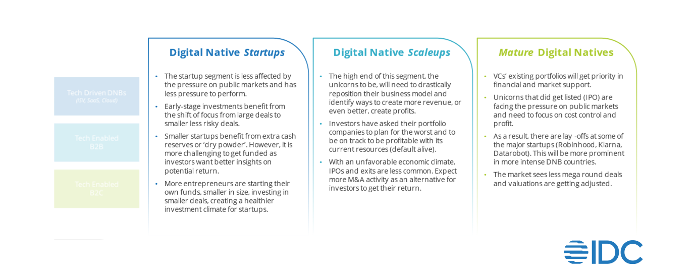 The more mature digital natives are the most susceptible to economic conditions and public market pressure. Unicorns and mature, publicly listed DNBs face tough public market conditions and many of them have announced layoffs. Those planning an initial public offering are postponing their plans, making it more difficult for investors to cash in on their investments. This creates a hurdle in the venture capital investment cadence and in turn, makes it harder for start-ups and scale-ups to secure additional funding.