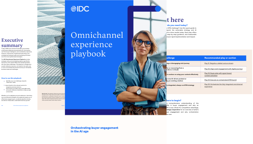 IDC’s omnichannel experience playbook lays out five field-tested plays designed to solve today’s biggest go-to-market (GTM) challenges. And for those ready to go deeper, the AI Supplemental Guide shows how to layer in personalization, integration, and innovation so you can move from reactive to real-time.