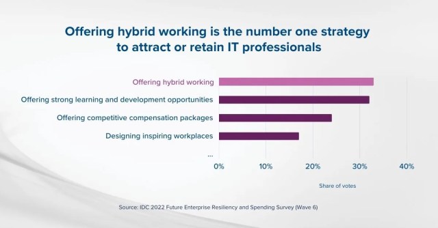 Job seekers increasingly prefer companies that enable them to work from home on a regular basis. Many employers have supported this preference to avoid losing applicants. IDC’s 2022 Future Enterprise Resiliency and Spending Survey (Wave 6) offers confirmation: One-third of respondents cited offering a hybrid working opportunity as their top strategy for attracting and retaining IT professionals.