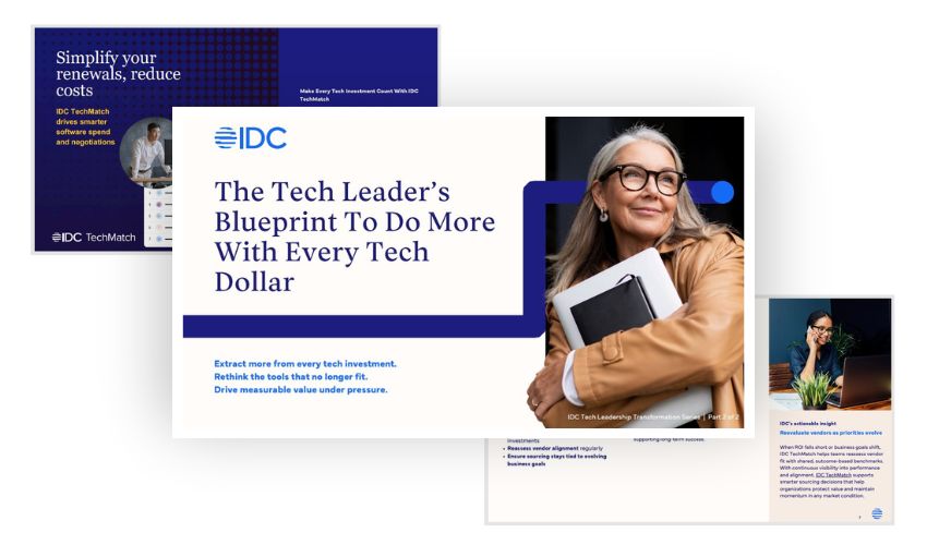 The Tech Leadership Transformation Series is your starting point. These two executive guides walk you through how to assess, realign, and act with clarity, giving you a practical path to simplify renewals, replace what no longer fits, and do more with every tech dollar. Download both guides. Then see how IDC TechMatch helps you go further and faster, with the visibility and confidence to lead what’s next.