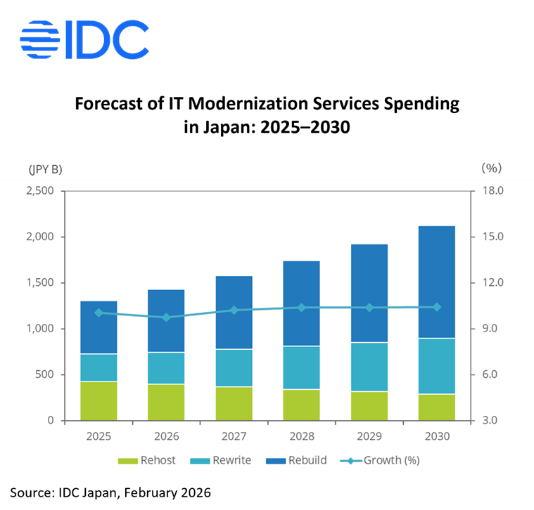 IDC has published a comprehensive analysis of Japan’s IT modernization market: 2026 Japan IT Modernization Market Analysis. The report provides a medium-term market forecast for IT modernization of legacy systems — a primary growth driver in IDC’s Japan IT services market outlook. Legacy systems are characterized by aging and obsolescence, excessive complexity and scale, and a lack of transparency. It covers enterprises’ IT modernization trends and an analysis of the service vendors’ services trend. Market forecasts are segmented by service type, execution type (rehost, rewrite, rebuild), system type, and industry vertical. Together, these analyses offer a comprehensive view of shifting enterprise needs, emerging market opportunities, and the strategies and service offerings of leading vendors in Japan’s IT modernization landscape.