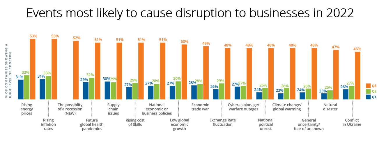 During Q1 and Q2, not too many more than a third of companies said they felt they were experiencing major impacts from the macroeconomic trends we asked about. In Q3, this rose to around a half. Inflationary costs were seen across more of the business, energy price rises became a reality, and national and global recessions became less likely to avoid. At the same time, markets still battled ongoing supply chain challenges, in part brought on by continued to reactions to the COVID pandemic. Many of these impacts are intertwined, making the current macroeconomic landscape even more difficult for companies to navigate.