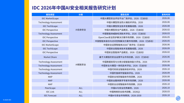 IDC已于2026年启动AI安全技术系列研究,围绕AI原生安全架构、安全智能体成熟度评估、AI驱动DevSecOps实践路径及企业级AI治理框架展开深入分析。