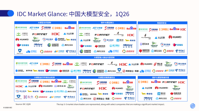 与此同时,大模型、智能体的安全检测与防护也少不了AI的赋能即安全智能体的加持。当前众多技术服务提供商已经将安全智能体和智能体集群的能力集成到其安全解决方案中,帮助用户提质增效,用AI对抗AI、AI防护AI将成为未来大模型安全、智能体安全防护的一个重要思路与能力。IDC同期发布《IDC MarketGlance:中国安全智能体,2026Q1》(Doc#CHC53597826),希望通过IDC对于中国市场中安全智能体产品的调研来帮助用户充分地了解安全智能体相关技术的发展和市场格局,详见下图: