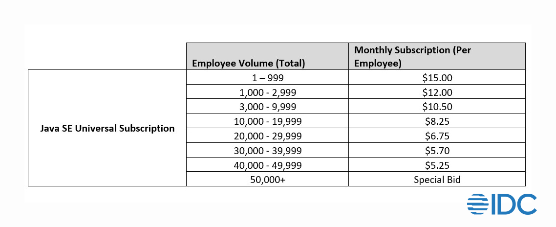 As an example, a customer with 20,000 employees utilizing JAVA SE in any capacity under the new subscription terms would need to purchase JAVA SE Universal Subscriptions for all 20,000 Employees, at a monthly rate of $6.75, total $1.62M per annum.