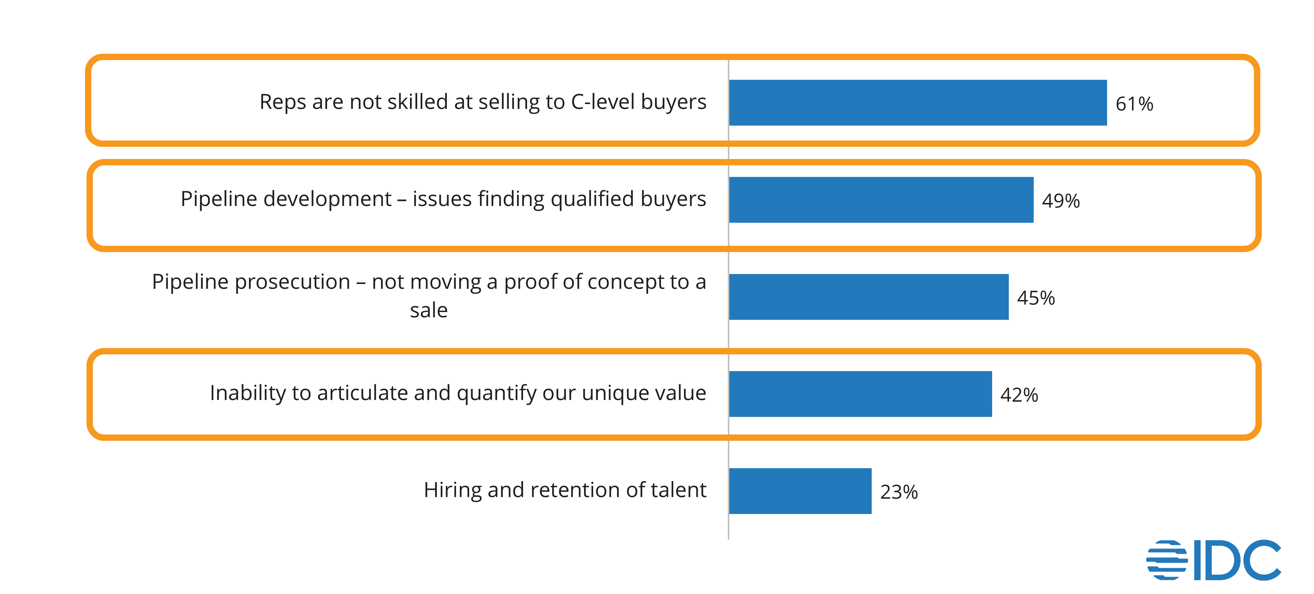 A recent IDC survey found that 61% of sales reps are not skilled at selling to C-level buyers and 49% are having issues finding qualified buyers.
