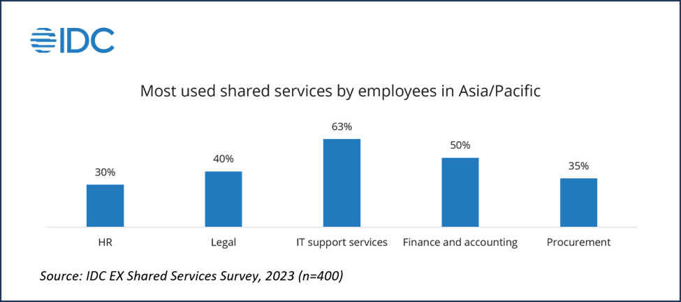 In the Asia-Pacific region, shared services have become a cornerstone for organizational support, particularly in IT, finance, legal, HR, and procurement (see figure below). These shared services are heavily process-oriented, streamlining repetitive and routine tasks across these critical functions. Their process-driven nature renders them ideal for the integration of automation and artificial intelligence. As these sectors typically involve repetitive and rule-based tasks, they stand to gain significantly from the efficiency, accuracy, and scalability that AI and automation technologies can provide, transforming the landscape of shared services with innovation and smart systems. As AI and automation are among the top technology investments for Asia/Pacific businesses in 20241 , IDC anticipates that these technologies will be more widely applied to improve shared services.