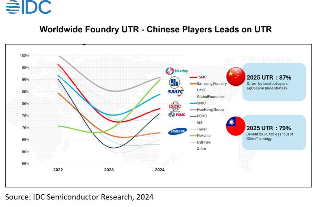 Driven by the “China+1” policy, there will be more orders transferred from China to Taiwan from U.S. Fabless, which will help Taiwan foundry players’ UTR to improve. IDC expects the UTR of Taiwan in 2025 will be 79%.