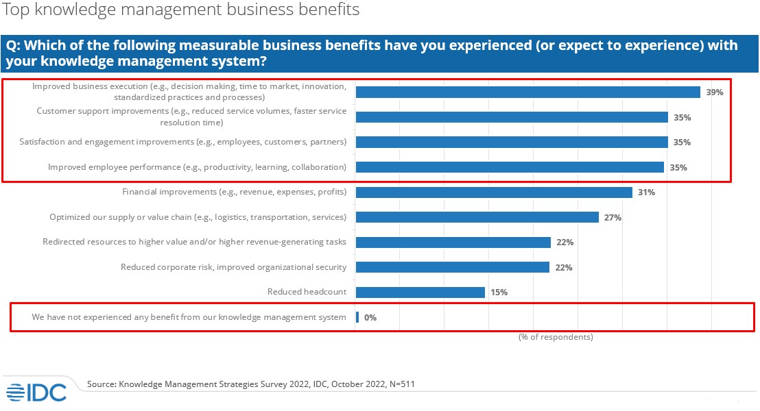 A recent IDC survey shows that the numerous named benefits from knowledge management systems tie in with the previously mentioned motivators (see Figure 1). The top four benefits highlight improvements in business execution, customer support, satisfaction, and employee performance that address operational gains in the business overall. Ultimately, these benefits lead to a positive bottom-line financial impact and plainly make the case for knowledge management as an essential business operations tool.