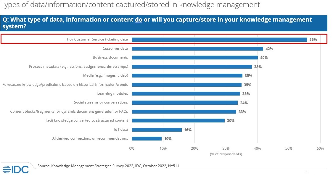 Figure 2 notes that knowledge management systems address a wide range of organizational information. Given that the top use identified in the survey is in the compliance/records management and IT departments, the highest percentage of data stored in knowledge management is IT or customer service ticketing data at 56%. This data type corresponds with the compliance/records management and IT departments where knowledge management usage is highest. However, we also find a large variety of information assets residing in these systems as well, including customer data, business documents, process metadata, rich media, forecasted knowledge, learning modules, social streams/conversations and content blocks/fragments for dynamic document generation and others. It demonstrates knowledge management’s ability to manage all sorts of content and data types.