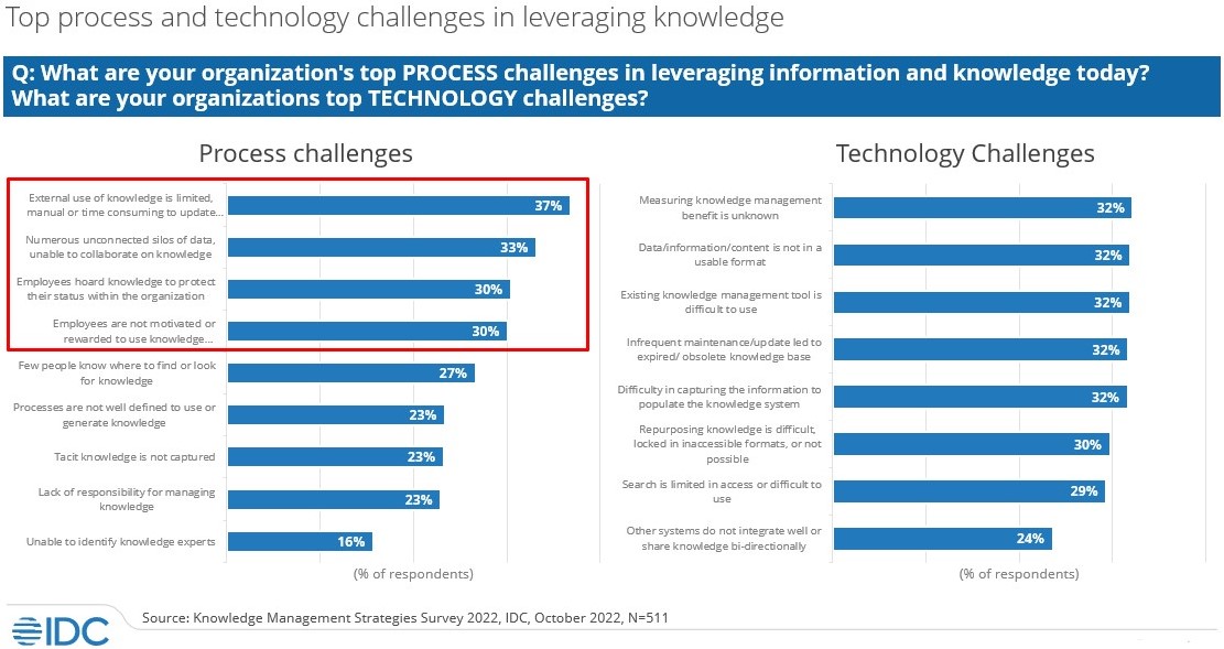 Of course, knowledge management systems are still evolving and there are considerable process and technology challenges to address (see Figure 3). The IDC survey identified the top process challenge as the “external use of knowledge is limited, manual and/or time consuming to update and maintain”. Other significant process challenges highlight that: