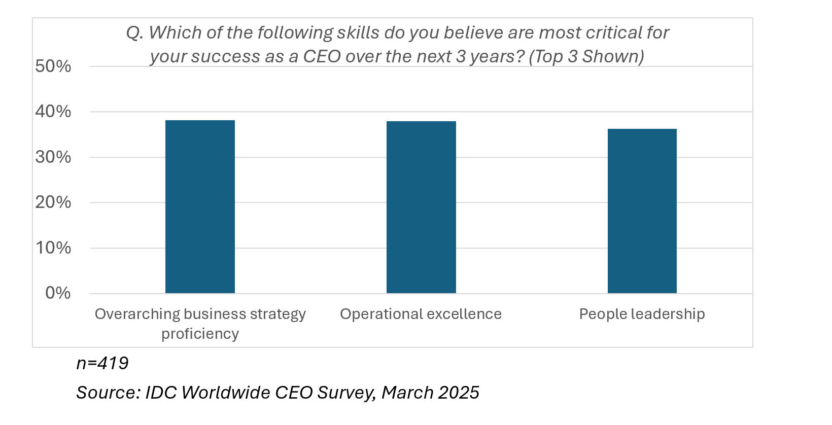 Earlier this year, IDC conducted our annual CEO Study including 419 CEOs and 15 in-depth CEO interviews. We explored business priorities, risks, approach to AI, technology priorities, and vendor perceptions.