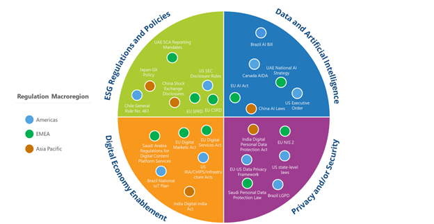 IDC’s Worldwide Digital Regulation Radar solves this problem (IDC #US523524224). It categorizes digital regulation into four main areas: environmental, data and AI, privacy and security, and digital economy enablement regulations.