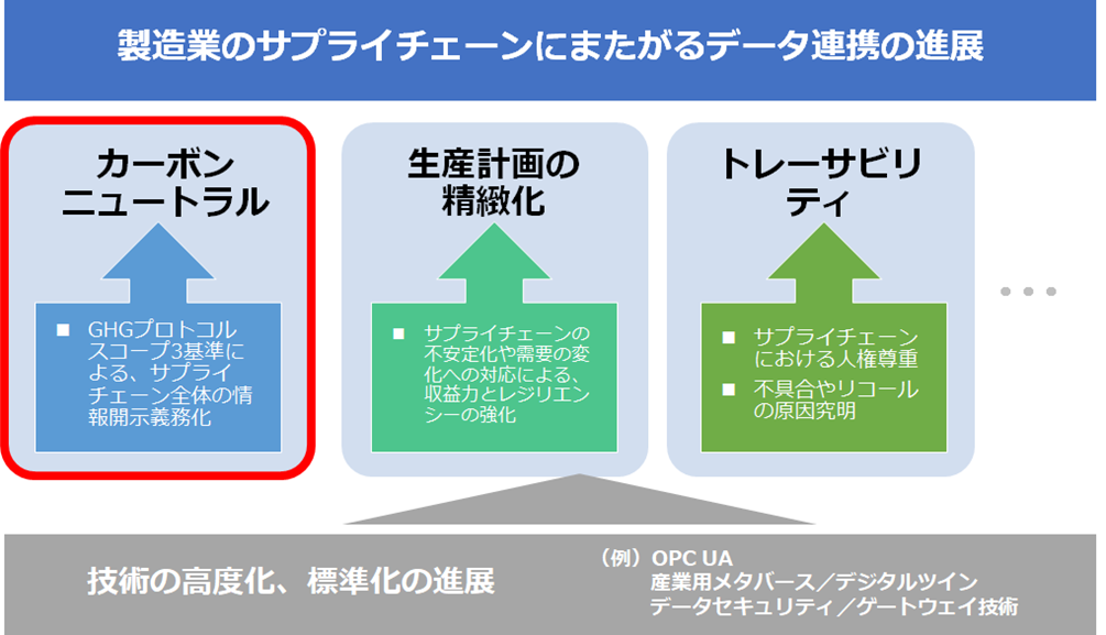 製造業のデータ連携で今後、特に重要になる分野として、下図に示す「カーボンニュートラル」「生産計画の精緻化」「トレーサビリティ」などが挙げられます。中でも今後、取り組みが加速すると見込まれるのが、カーボンニュートラル実現のためのサプライチェーンをまたがるデータ連携です。