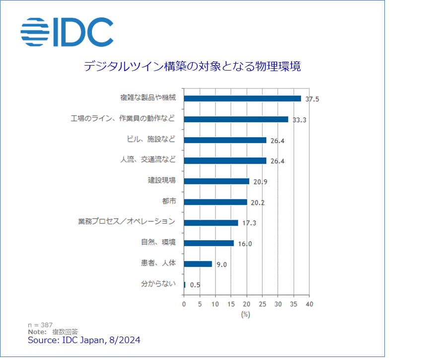さらに、OT(Operational Technology、物理的なシステムや設備を最適に動かすための制御・運用技術の総称)関連の物理環境のデジタルツインをすでに導入または導入を検討している企業に、デジタルツイン構築の対象となる物理環境についてたずねたところ、最も多かった回答が「複雑な製品や機械」(37.5%)、次いで「工場のライン、作業員の動作など」(33.3%)でした。また、3位は同率で「ビル、施設など」「人流、交通流など」(26.4%)でした。