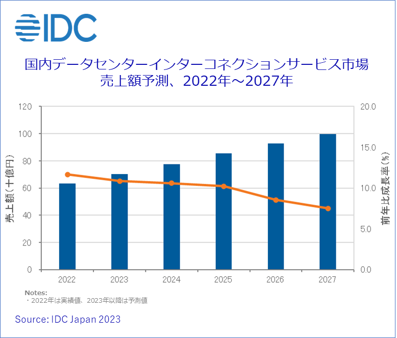 Japan, 2023年12月20日 – IT専門調査会社 IDC Japan 株式会社(所在地:東京都千代田区九段北1‐13‐5、代表取締役社長:村橋俊介、Tel代表:03-6897-3812)は、国内データセンター(DC)インターコネクションサービス市場予測を発表しました。IDCでは、2027年の国内DCインターコネクションサービスの売上額を997億6,800万円、2022年~2027年の年間平均成長率(CAGR:Compound Annual Growth Rate)を9.5%と予測しています。