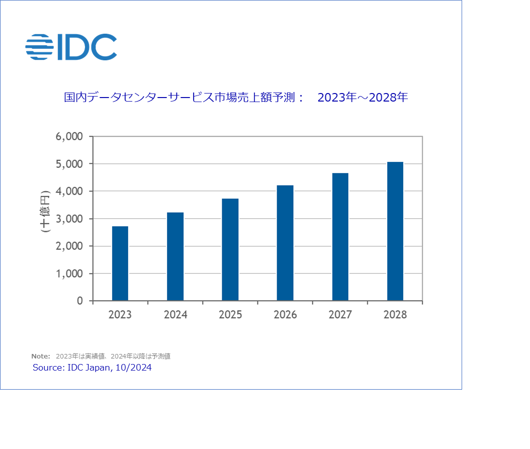 Japan, 2024年10月28日 – IT専門調査会社 IDC Japan 株式会社(所在地:東京都千代田区九段北1‐13‐5、代表取締役社長:村橋俊介、Tel代表:03-6897-3812)は、国内データセンターサービス市場予測を発表しました。これによると、同市場は2023年で2兆7,361億円でしたが、2023年~2028年の年間平均成長率(CAGR:Compound Annual Growth Rate)は13.2%で拡大し、2028年には遂に5兆円を超えて5兆812億円に達すると予測しています。