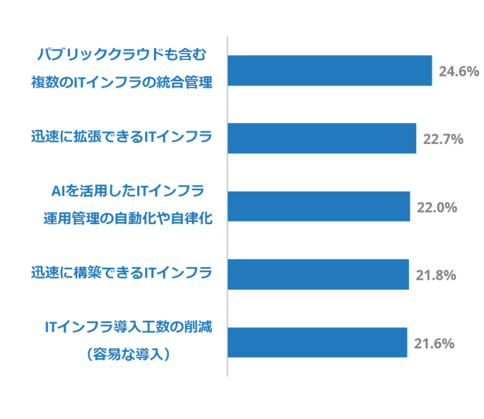 これによると、ITインフラが変化への対応能力を十分に備えていると考える回答者は8.8%に留まり、9割を超える回答者が改善の余地があると考えています。2年後に複数のクラウドの利用を見込む割合は81.9%に達しました。これらを背景に、ITインフラ投資で重視する項目では、複数のITインフラの統合管理、ITインフラの迅速な導入や拡張、AIを活用した運用管理の自律化が上位となりました。