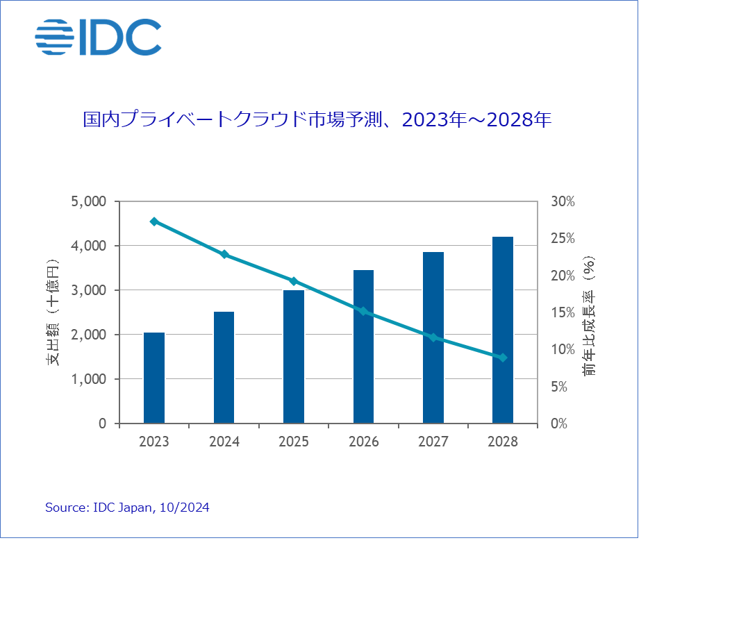 Japan, 2024年10月7日 – IT専門調査会社 IDC Japan 株式会社(所在地:東京都千代田区九段北1‐13‐5、代表取締役社長:村橋俊介、Tel代表:03-6897-3812)は、国内プライベートクラウド市場予測を発表しました。これによると2023年の国内プライベートクラウド市場は、前年比27.3%増の2兆533億円(支出額ベース)となりました。また、同市場の2023年~2028年の年間平均成長率(CAGR:Compound Annual Growth Rate)は15.4%で推移し、2028年の市場規模は2023年比約2倍の4兆2,126億円になるとIDCは予測しています。