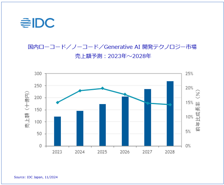 Japan, 2024年11月25日 – IT専門調査会社 IDC Japan 株式会社(所在地:東京都千代田区九段北1‐13‐5、代表取締役社長:村橋俊介、Tel代表:03-6897-3812)は、国内ローコード/ノーコード/Generative AI開発テクノロジー市場予測を発表しました。これによると、同市場全体の2023年の市場規模(売上額ベース)は1,225億円となり、2023年~2028年の年間平均成長率(CAGR:Compound Annual Growth Rate)は17.1%で拡大し、2028年には2,701億円になると予測しています。