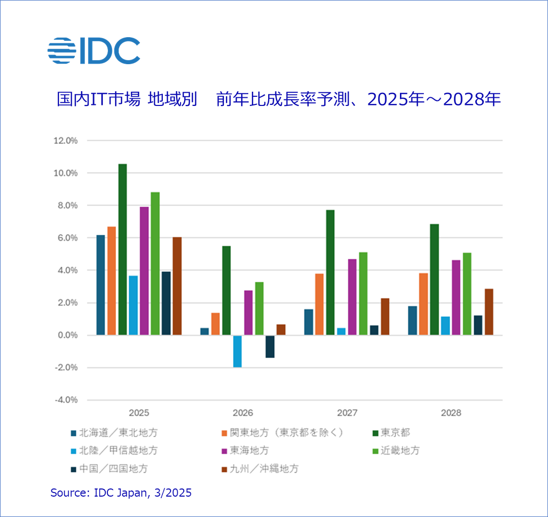 国内IT市場 地域別 前年比成長率予測、2025年~2028年