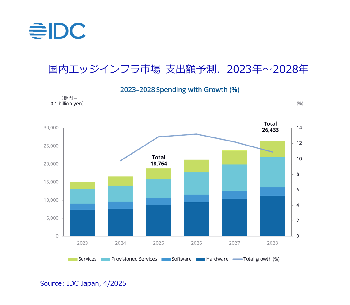 Japan, 2025年4月8日 – IT専門調査会社 IDC Japan 株式会社(所在地:東京都渋谷区渋谷二丁目24番12号、代表取締役社長:村橋俊介、Tel代表:03-6897-3812)は、国内エッジインフラ市場の最新予測を発表しました(「IDC Worldwide Edge Spending Guide 」)。今回新たに追加された産業分野には27業種が含まれ、特に、主要となる製造業では、自動車、工業、消費財、ライフサイエンス、ハイテク・エレクトロニクス、航空宇宙など、より詳細な市場セグメンテーションを提供しています。IDCによると、2025年の国内エッジインフラ市場の支出額は、前年比12.9%増の約1兆9千億円になると予測しています。2023年~2028年の5年間における年間平均成長率(CAGR:Compound Annual Growth Rate)は11.8%で成長し、2028年の同支出額は、約2兆6千億円になると予測しています。