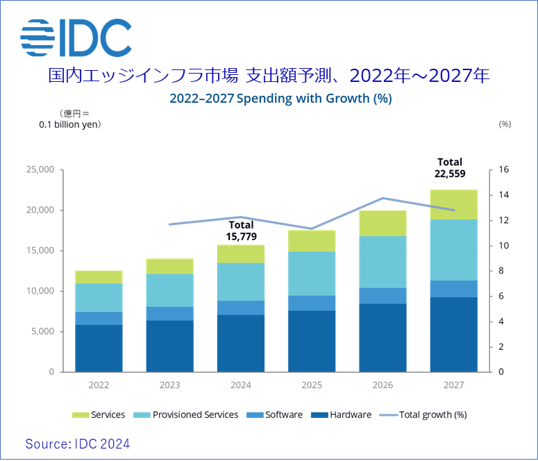 Japan, 2024年3月22日 – IT専門調査会社 IDC Japan 株式会社(所在地:東京都千代田区九段北1‐13‐5、代表取締役社長:村橋俊介、Tel代表:03-6897-3812)は、国内エッジインフラ市場予測を発表しました。これによると、2024年の国内エッジインフラ市場の支出額は、前年比12.3%増の1兆6千億円になると推計しています(図)。また、2022年~2027年の5年間における年間平均成長率(CAGR:Compound Annual Growth Rate)は12.4%で、2027年の同支出額は、2兆3千億円になるとIDCは予測しています。(IDC Worldwide Edge Spending Guide (Edge SG)より)