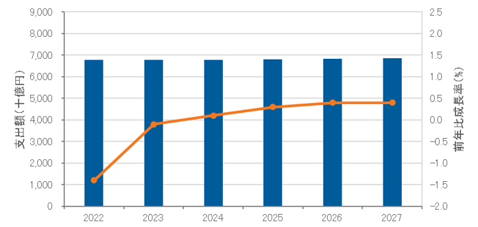 国内モバイル通信サービス市場 支出額予測、2022年~2027年