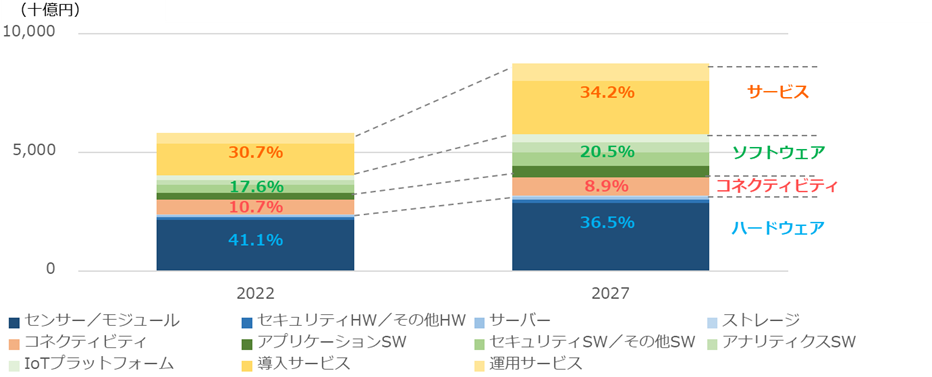 国内IoT市場 技術別の支出額規模予測と支出額割合、2022年と2027年の比較