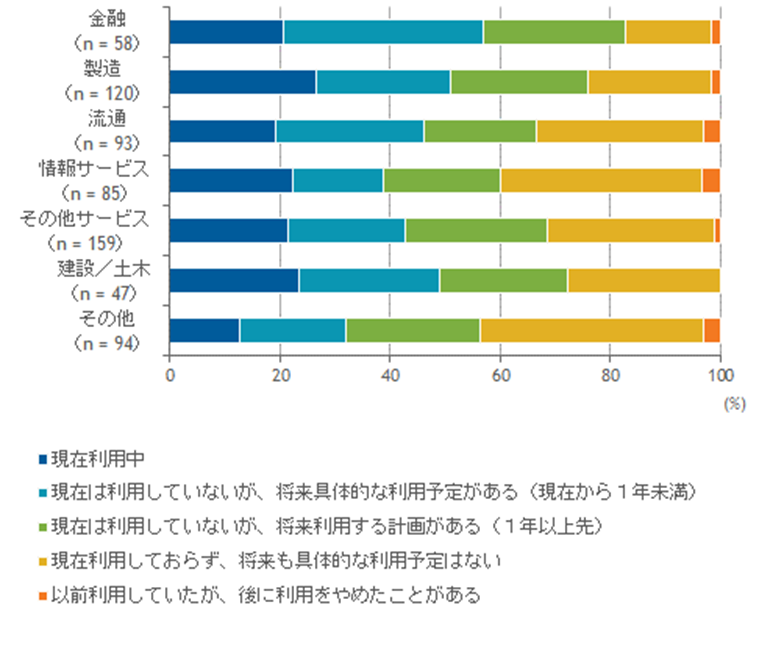 なお、同様の傾向は、ITインフラの包括的アウトソーシングサービスや、ローカル5Gインフラストラクチャにおいても見られます。金融や製造に加え、IoTやモビリティなどの先進的な取り組みが進んでいる建設/土木において、それらのサービスを利用中/利用予定/利用を計画しているとの回答率が高い傾向が見られました。