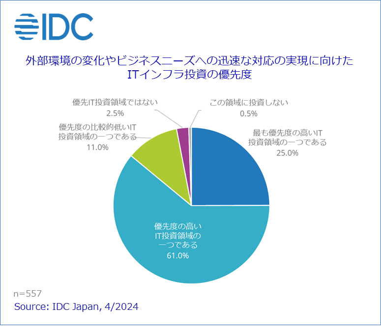 Japan, 2024年4月8日 – IT専門調査会社 IDC Japan 株式会社(所在地:東京都千代田区九段北1‐13‐5、代表取締役社長:村橋俊介、Tel代表:03-6897-3812)は、国内ITインフラ支出動向調査の分析結果を発表しました。これによると、外部環境の変化やビジネスニーズへの迅速な対応の実現に向けたITインフラ投資を、最優先または優先のIT投資項目とした割合は86.0%に上りました。デジタルビジネスの成熟度別では、事業開始当初からデジタルテクノロジーを中核とする「デジタルネイティブビジネス」企業では、ITインフラ投資を最も優先度の高いIT投資領域の一つであるとする割合が60.0%と高い水準であり、デジタルビジネスを推進する上でITインフラ投資は重要なIT投資項目の一つとなっています。