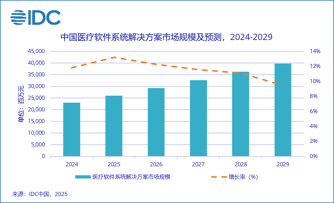 2024年中国医疗软件市场的需求加速释放,医疗应用软件解决方案的总体市场规模为230.3亿元人民币,比上一年增长11.8%。预计2025年医疗应用软件市场将保持快速增长,且未来五年中将保持较为高速的增长态势,预计2024至2029年的年复合增长率为11.5%,到2029年总市场规模将达到397.5亿元人民币。其中,基于国家政策的指导,区域医疗市场的需求增长迅猛,增速超过了医院市场。