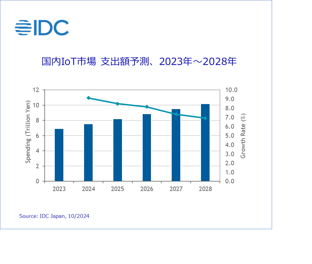 Japan, 2024年10月17日 – IT専門調査会社 IDC Japan 株式会社(所在地:東京都千代田区九段北1‐13‐5、代表取締役社長:村橋俊介、Tel代表:03-6897-3812)は、国内IoT(Internet of Things)市場予測に関するアップデートを発表しました。これによると、国内IoT市場におけるユーザー支出額について、2023年の実績は6兆9,189 億円であり、その後、2023 年~2028 年の年間平均成長率(CAGR:Compound Annual Growth Rate) 8.0%で成長し、2028 年には10 兆1,653 億円に達するとIDC では予測しています。(図参照)